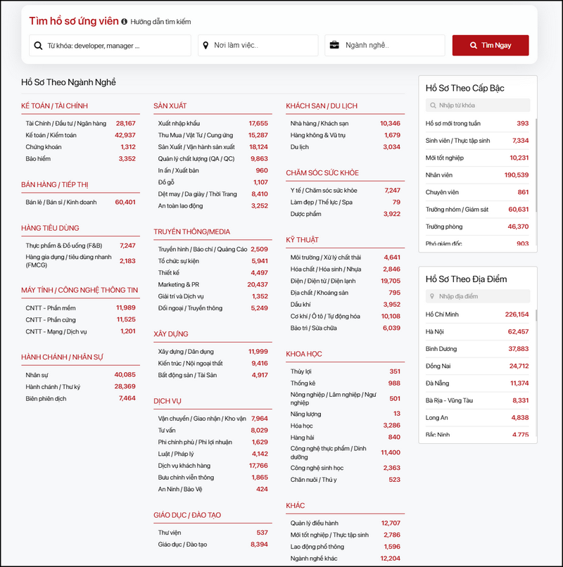 Khi click vào nút “Tìm hồ sơ ứng viên”, dẫn đến trang tìm ứng viên, Thành viên có thể chọn ứng tìm ứng viên theo Ngành nghề, theo Cấp bậc, theo Địa điểm.Để tìm kiếm ứng viên ngẫu nhiên, Thành viên chọn “Tìm ngay”